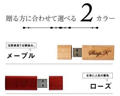 ・ 対応OS Windows,Mac ・ 容量 8GB ・ インターフェイス USB 2.0 ● サイズ 19.2mm x 60.4mm x 9.5mm 重さ9g ● 素材 メープル・ローズ : 木製 ●備考 彫刻する文字(お名前)は、ご注文フォームにてご指定ください。