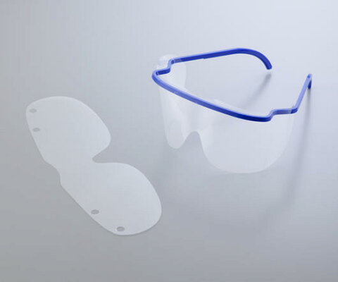 仕様 ●サイズ(mm):175×95 ●入数:1箱(フレーム×2本、シールド×20枚) ●材質:フレーム/ABS樹脂、シールド/PET ●サイズ:フレーム/217×69mm、シールド/126×168mm ●めがね併用不可 ●防曇加工 ●アルコール清拭可(フレーム) ●重量:9.5g