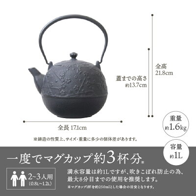 【お礼の品・配送に関するお問い合わせは、(及源鋳造株式会社:0197-24-2411)までお願いします】 商品説明 名称 南部鉄器 鉄瓶 瓜型小紋梅 1L H-270 製造 岩手県奥州市水沢産 南部鉄器 素材 本体:鋳鉄 持ち手:鋼材 サイズ 満水容量:1L 使用人数目安:2~3人用(0.8L~1.2L) 注ぎ口を含む全長:17.1cm 持ち手を含む全高:21.8cm 蓋までの高さ:13.7cm 底面直径:7.7cm 重量:1.6kg 本体直径:14cm ※本体大きさや重量、容量は制作工程の都合上表記と若干誤差がある場合がございます。